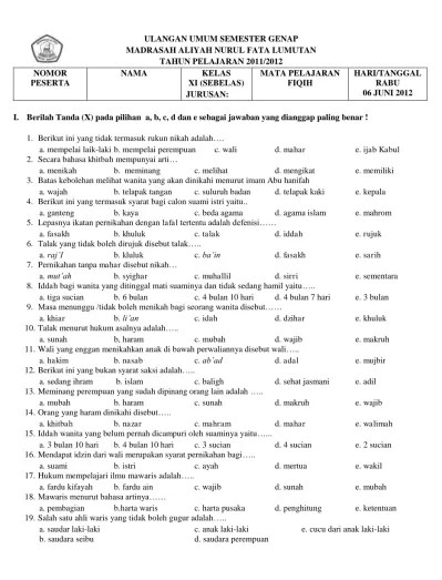 Uambn adalah ujian akhir madrasah berstandar nasional yang dilaksanakan pada . Dan untuk copy paste diperbolehkan asal digunakan untuk . Link download file bisa sobat temukan di bawah soal online uambn fiqih ma ini. Kerjakan soal ukm ppg fiqih ma mapel fiqih ma. B erikut ini adalah kisi kisi soal fiqih uambn ujian akhir madrasah berstandar nasional madrasah ibtidaiyah mi madrasah tsanawiyah mts dan madrasah aliyah ma.